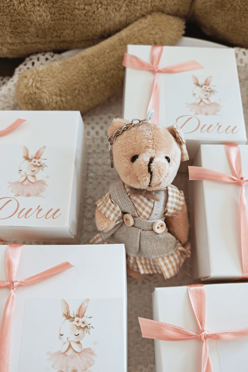 Elbiseli peluş ayıcık anahtarlık, doğum,