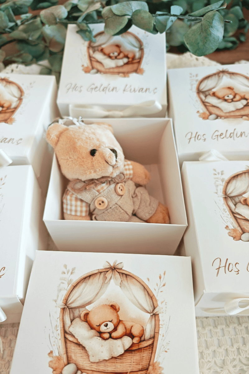 Beyaz Kutulu Elbiseli Peluş Ayıcık Anahtarlık Bebek Hediyelik