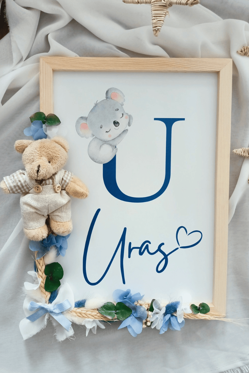 Çiçek Süslemeli - Peluş Ayıcıklı Erkek Bebek Kapı Süsü / Pano