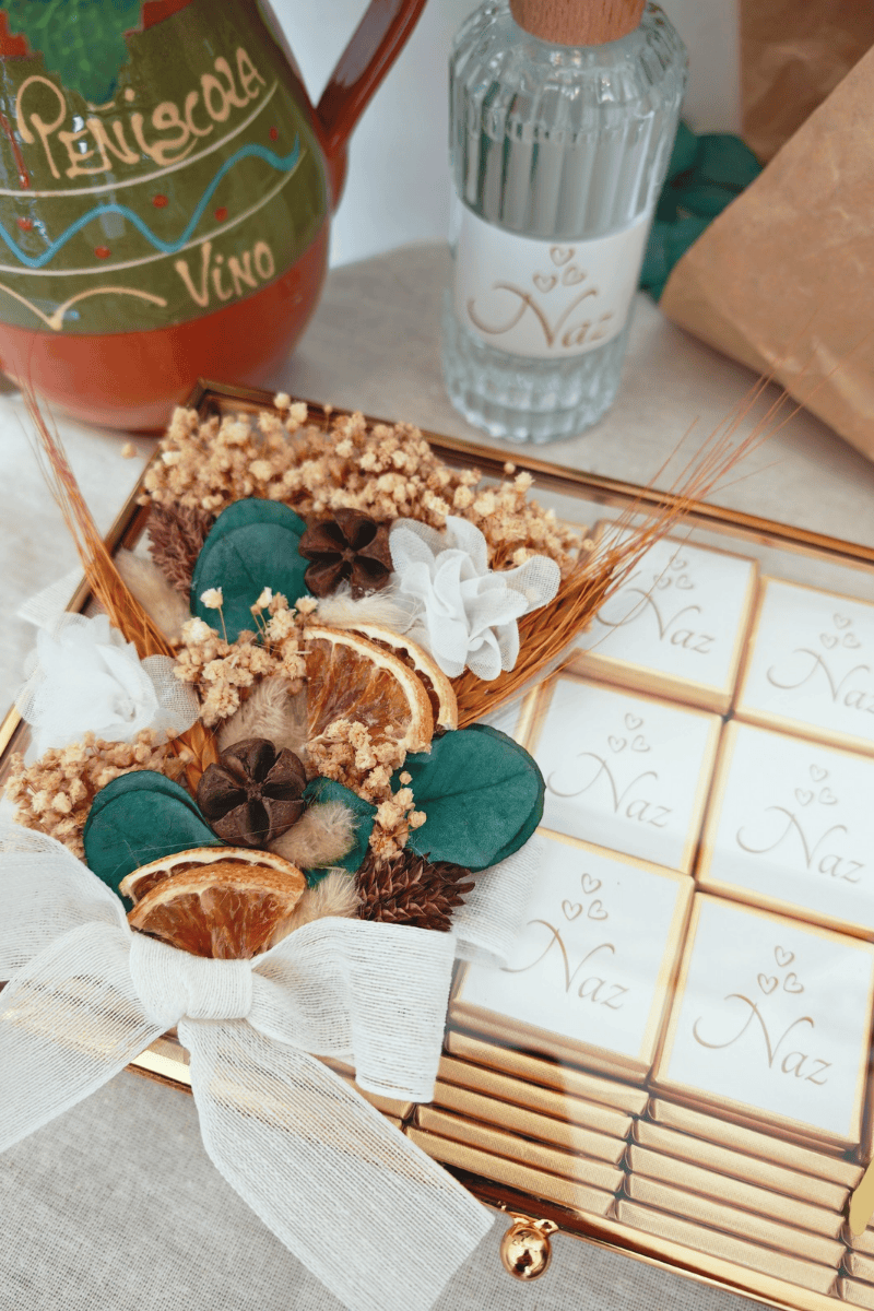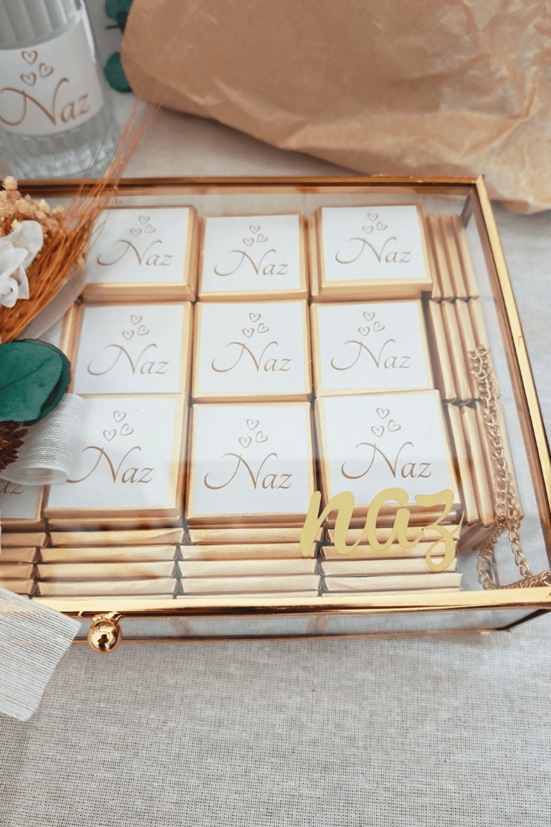 Çiçek süslemeli cam kutuda sunulan