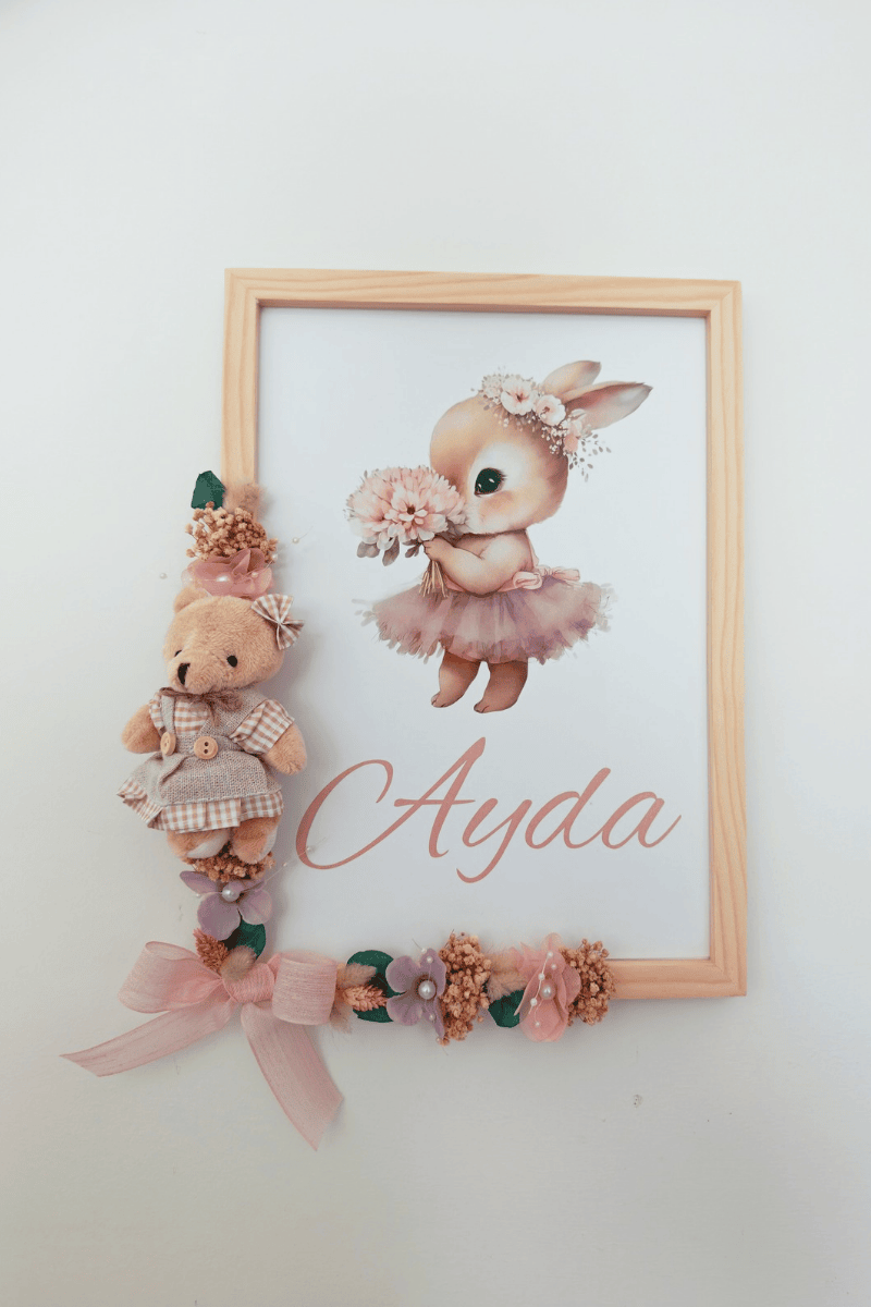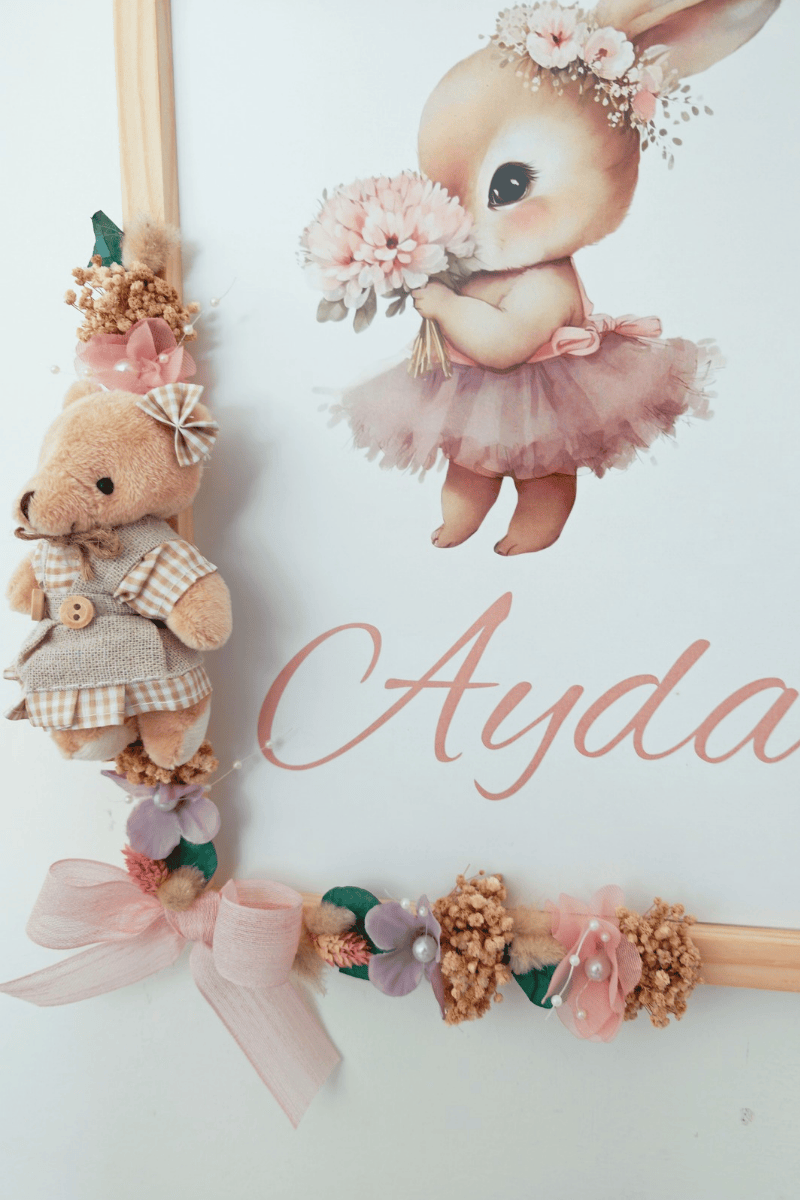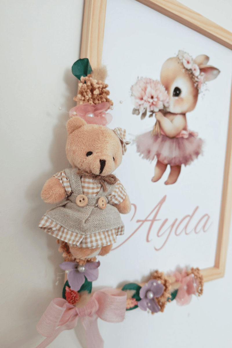 Çiçek Süslemeli - Peluş Ayıcıklı Bebek Kapı Süsü / Pano