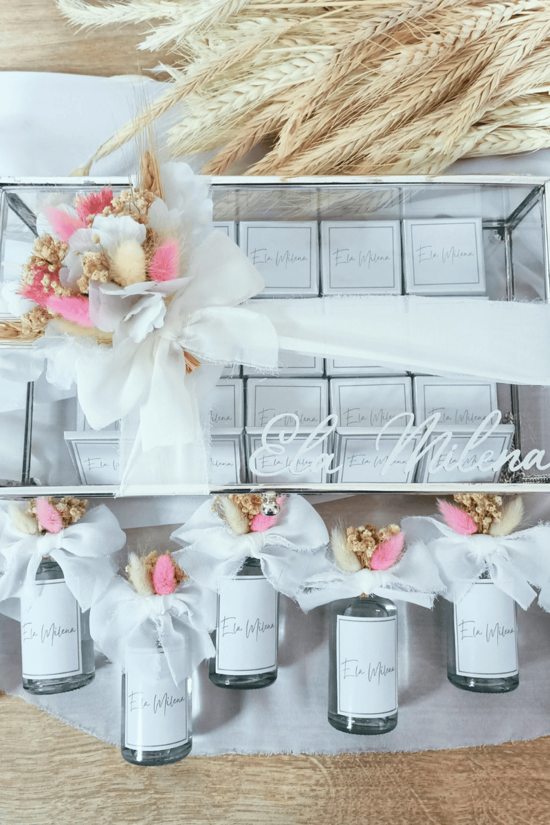 Çiçek süslemeli cam kutuda sunulan