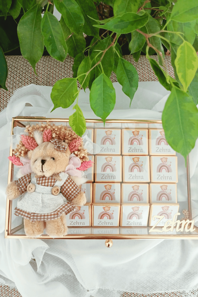 Çiçek Süslemeli - Peluş Ayıcıklı Cam kutuda 50' li Madlen Çikolata