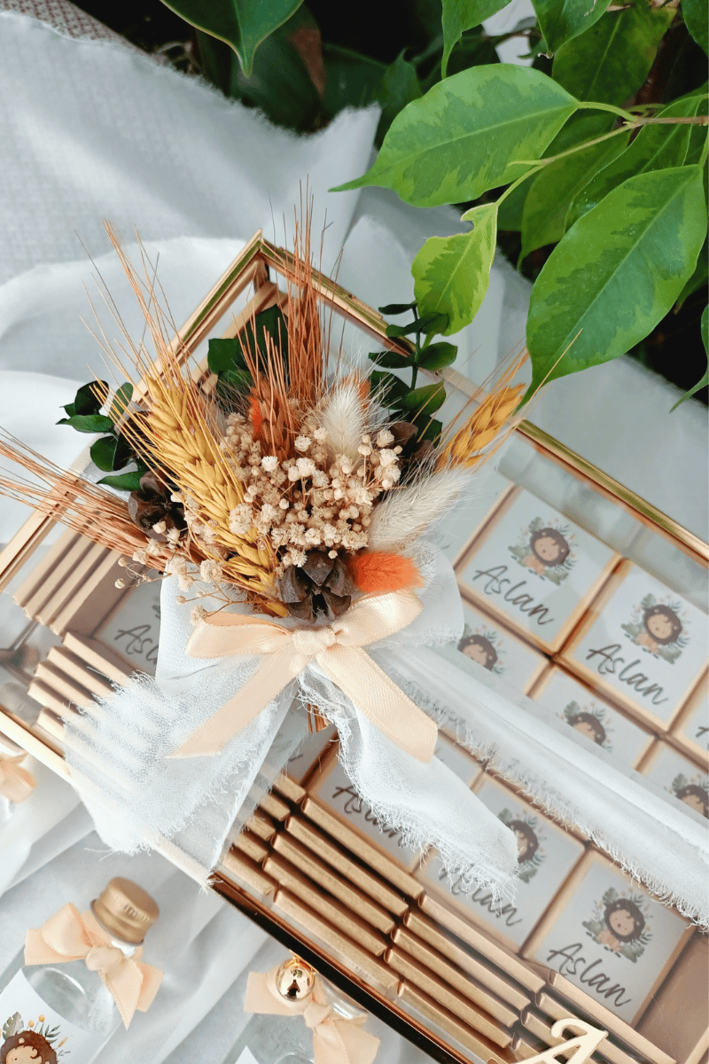 Çiçek süslemeli cam kutuda sunulan