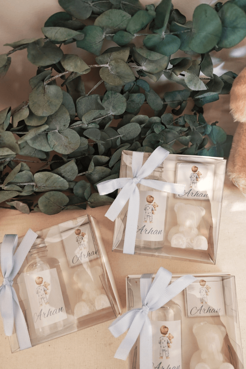 Madlen Çikolata & Cam Şişe Kolanya & Ayıcık Mum Kutulu Set Erkek Bebek Hediyelik