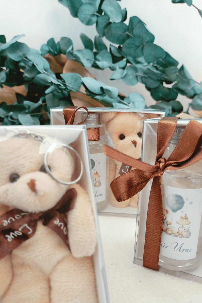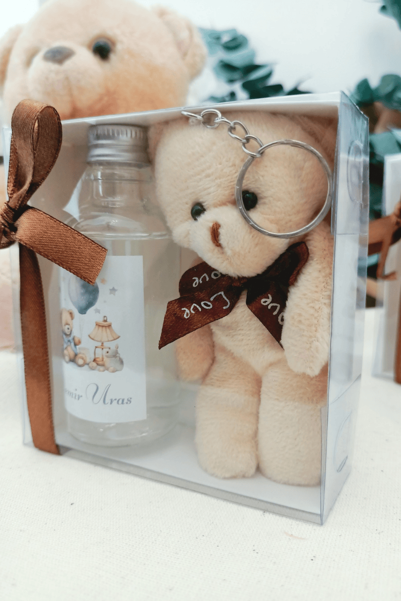 Peluş Ayıcık Anahtarlık & Cam Şişe Kolanya Kutulu Set Bebek Hediyelik