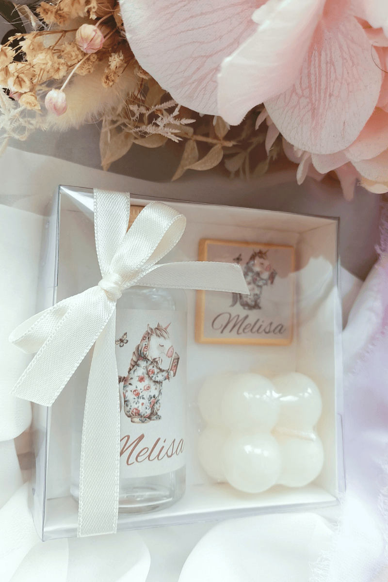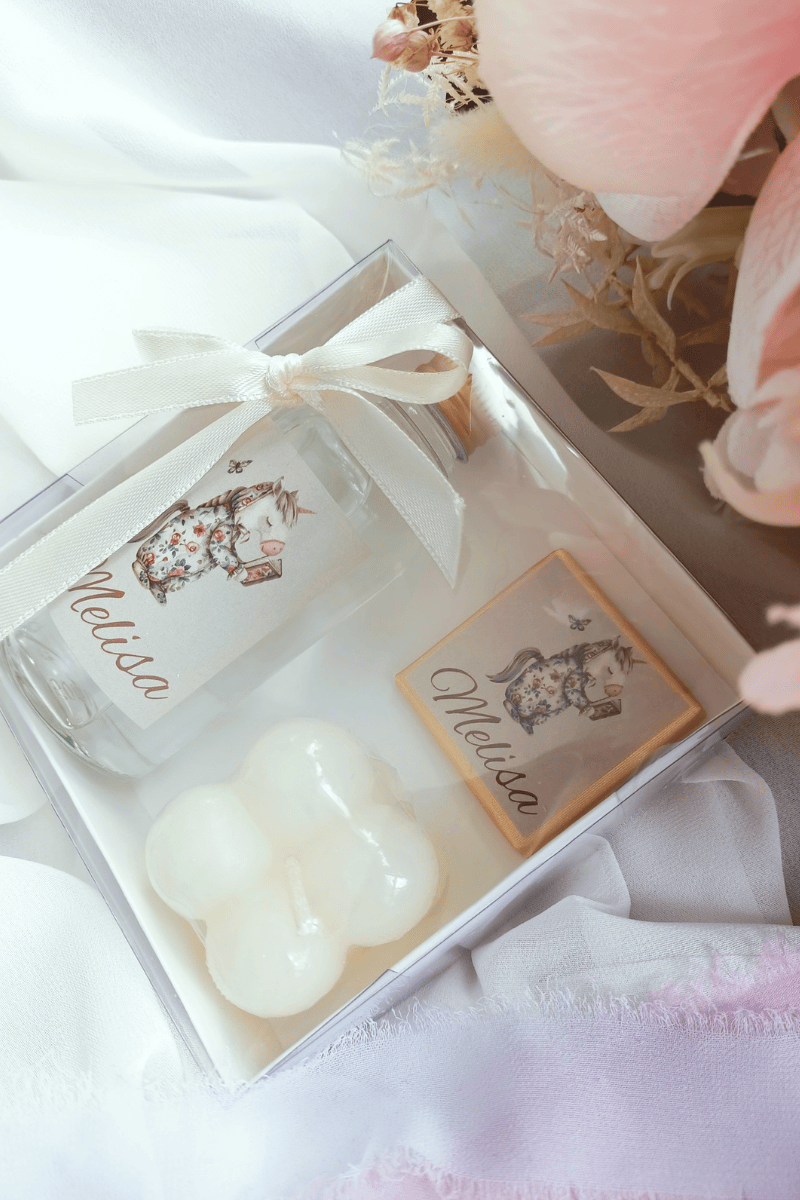 Madlen Çikolata & Cam Şişe Kolonya & Bubble Mum Kutulu Set Bebek Hediyelik