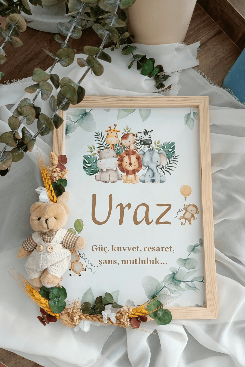 Safari Tasarımlı Çiçek Süslemeli - Peluş Ayıcıklı Erkek Bebebk Kapı Süsü / Pano