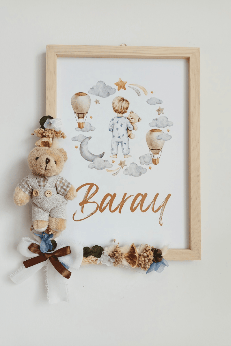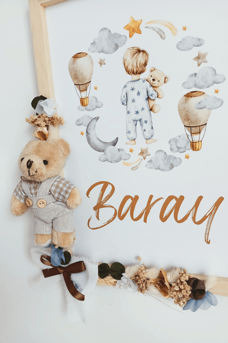 Çiçek Süslemeli - Peluş Ayıcıklı Erkek Bebek Kapı Süsü / Pano