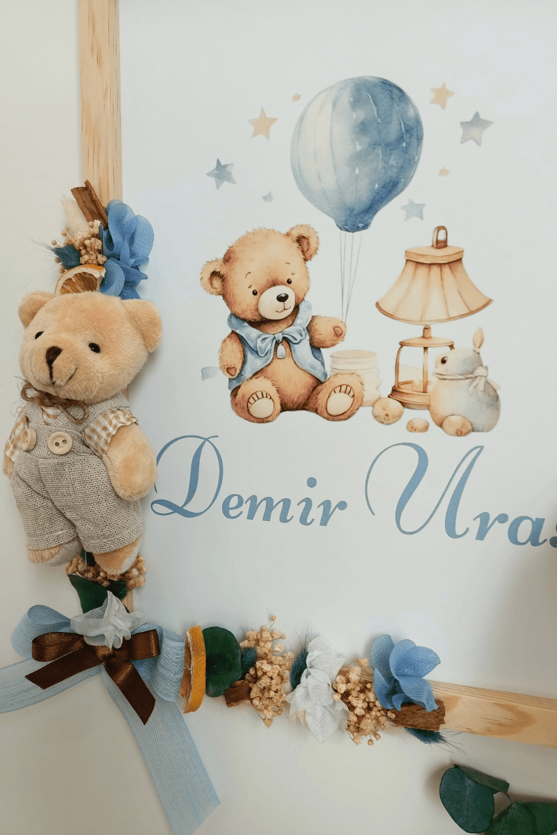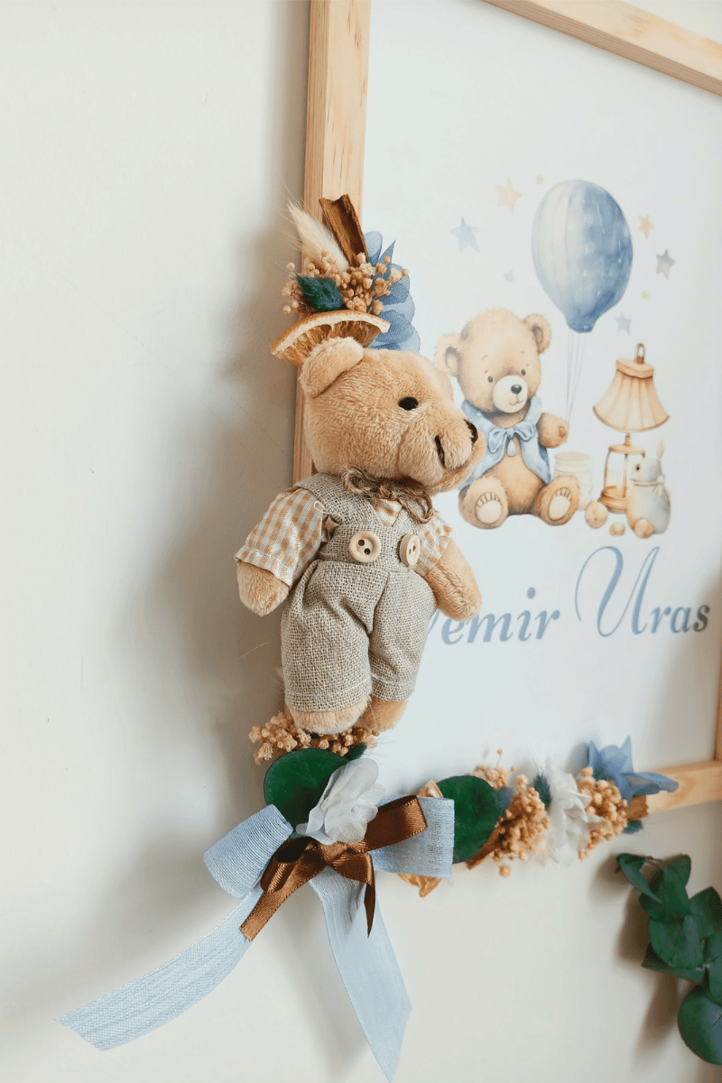 Çiçek Süslemeli - Peluş Ayıcıklı Bebek Kapı Süsü / Pano