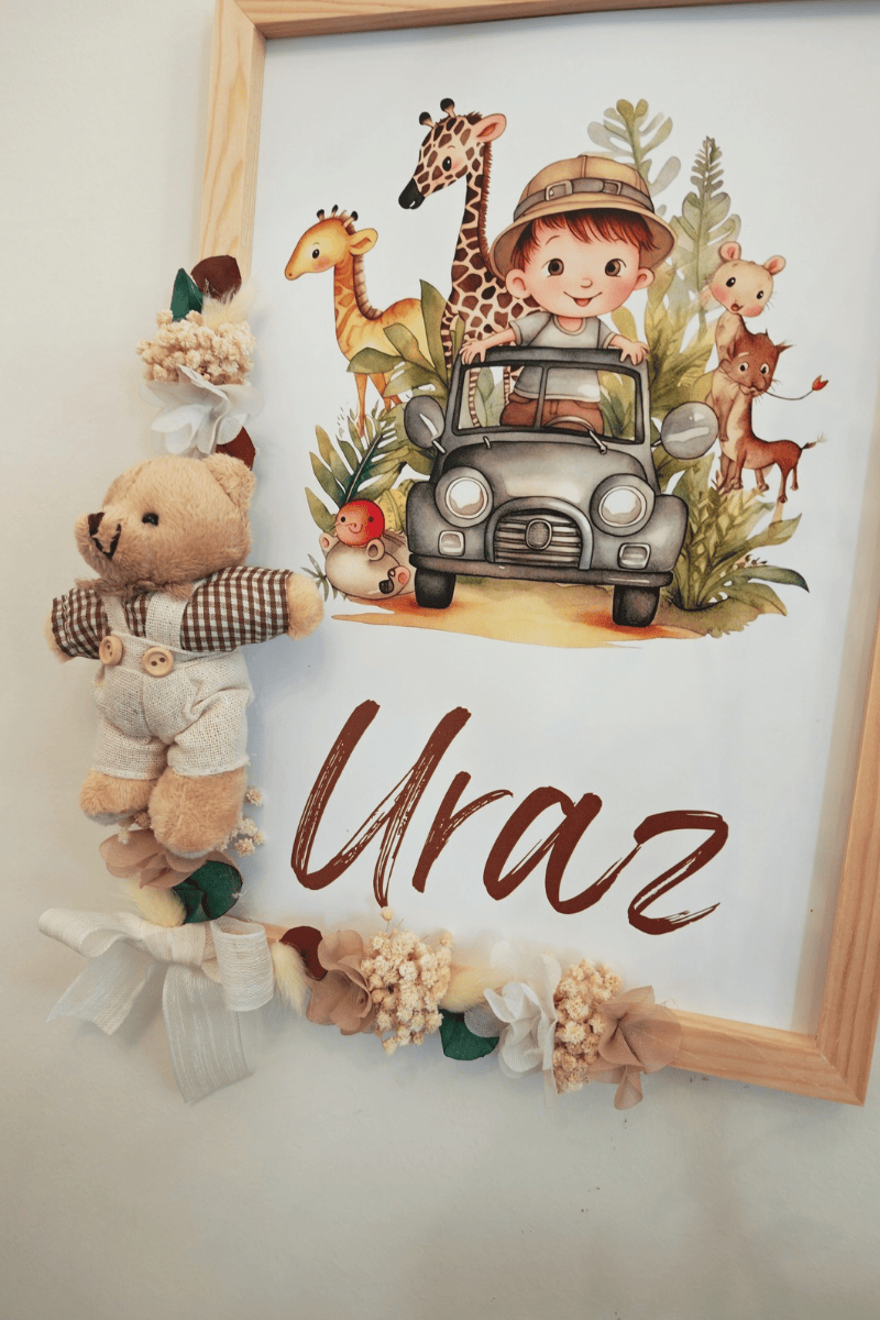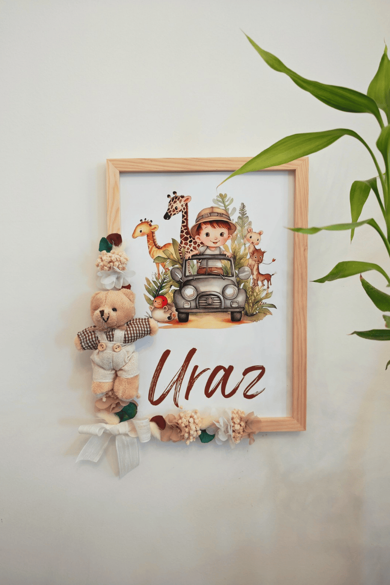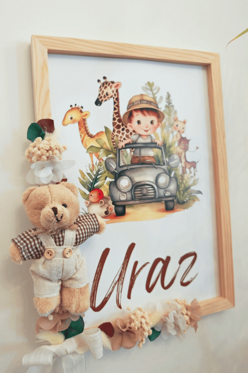 Çiçek Süslemeli - Peluş Ayıcıklı Safari Konsept Bebek Kapı Süsü / Pano