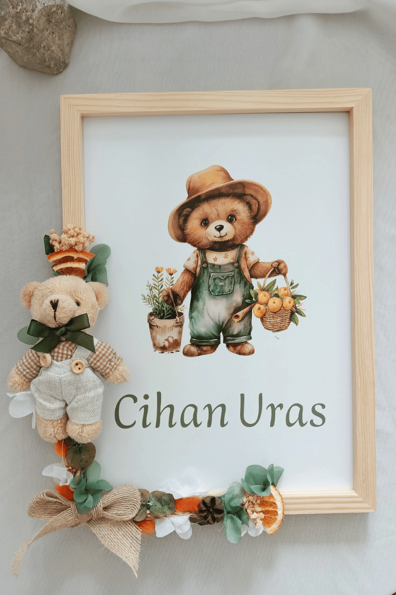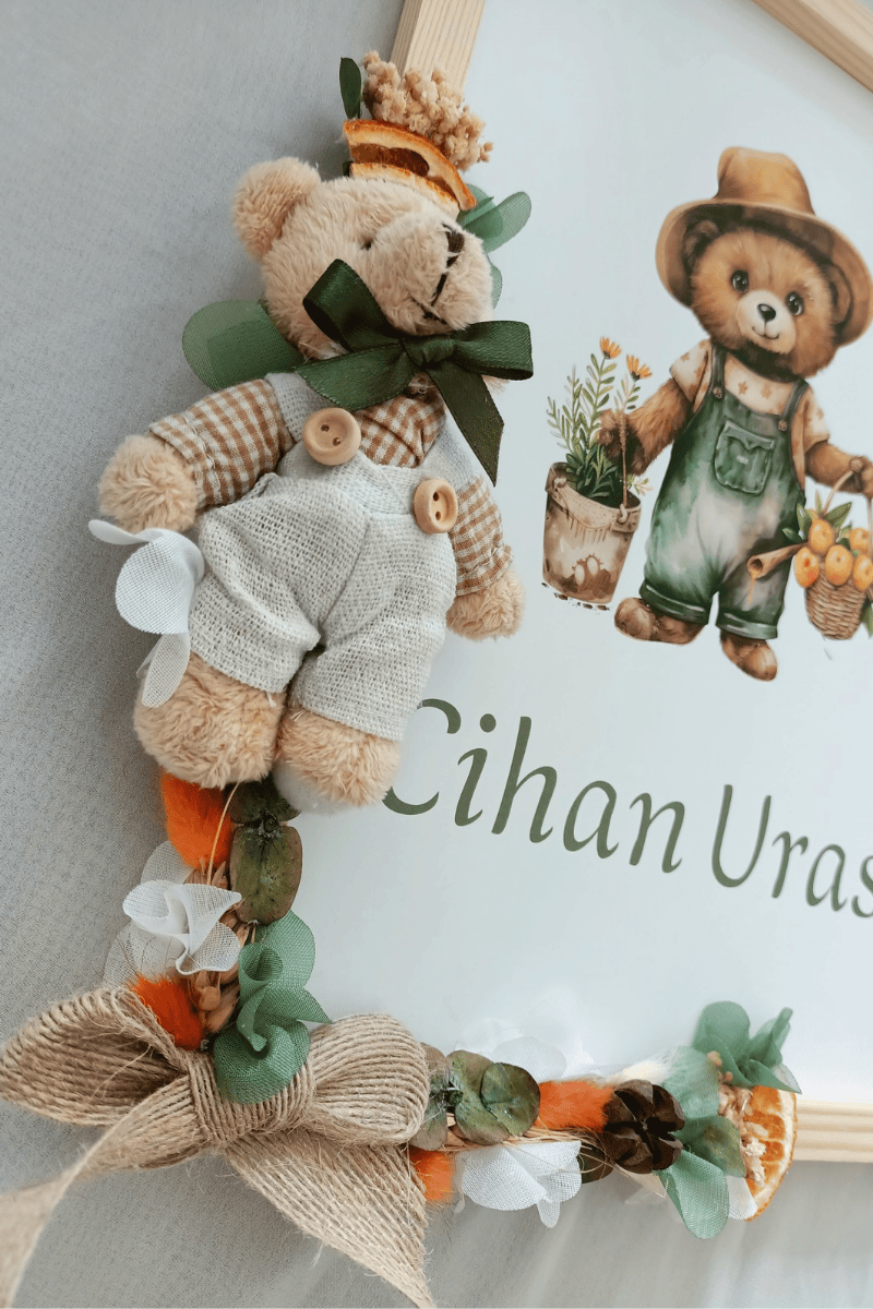 Çiçek Süslemeli - Peluş Ayıcıklı Bebek Kapı Süsü / Pano